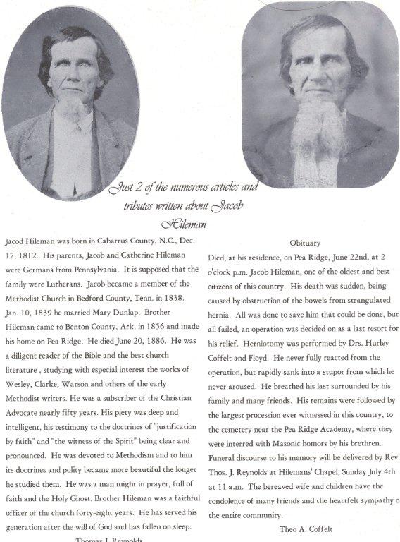 Jacob Hileman was born in North Carolina and died in Pea Ridge, Arkansas. On Jan 10, 1839, Jacob married Mary Dunlap (Feb 16, 1818 - May 20, 1904). Mary was the daughter of Mary Dunlap (1784 - 1884). They are both buried in the Pea Ridge, AR Cemetery. His obituary is show below.
