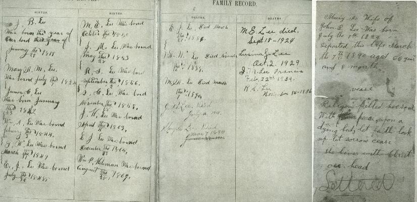 University of Arkansas Libraries, Fayettevile)Scan0001/0002 History of the Lee Family and marriage with Putmans It appears that part of the information came from the North Carolina archives (John Lee's military service in the Continental army) and the rest was passed down through the family.