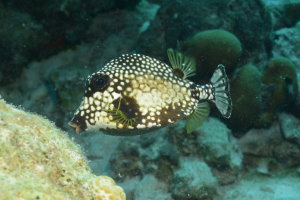 porcupine fish, sharpnose pufferfish, grouper, spotted drum, blue tang,