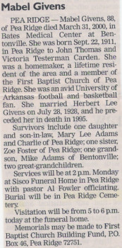 - On July 28, 1928, Mable Carden married Herbert Givens (born after 1907) in Pea Ridge Benton Co AR Herbert and Mable Givens had one child. They are buried in the Pea Ridge Cemetery.