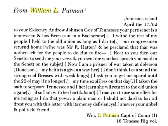 William L. Putman wrote a letter from Johnson's Island to Andrew Johnson on April 17, 1862 asking for a parole because of bad health.